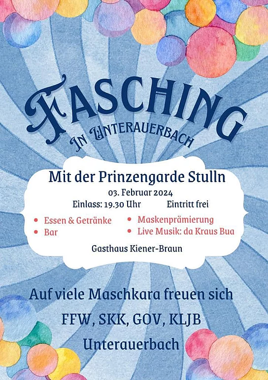 Zünftiger Gemeinschaftsball der FFW Unterauerbach, des GOV Unterauerbach, der KLJB Unterauerbach und der SKK Auerbachtal mit Live-Musik und Auftritt der Faschingsgarde der FG Stulln. Masken erwünscht: Maskenprämierung!