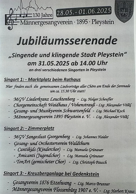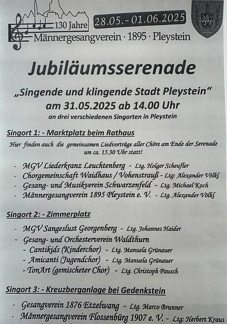 Der Gesangverein singt am 31.5.2025 in Pleystein um 14 Uhr zur Jubiäumsserenade. In Pleystein wird ab 14 Uhr an 3 Standorten am Ort gesungen. Es sind 12 Chöre eingeladen und sicher ein Klangerlebnis.