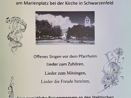 Offenes Singen vor dem Pfarrheim, Lieder zum Zuhören, Lieder zum Mitsingen, Lieder, die Freude bereiten. Für's gemütliche Beisammensein an den Stehtischen gibt's auch Getränke.