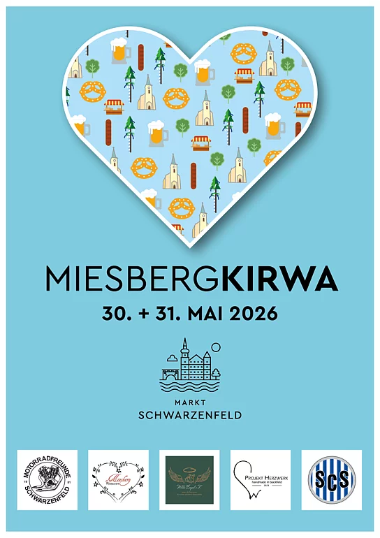 14:30 Uhr Kirwabaum-Festzug der Vereine von der Feuerwehr Schwarzenfeld zum Miesberg. Danach Aufstellen des Kirwabaums durch die Vereine mit Musik der Musikkapelle Schwarzenfeld und Kreitz & Quer, Verlosung des Baums, Ausschank und Essen sowie Tänze und Plattler des Volks- und Gebirgstrachtenvereins D'Miesbergler. - Sonntag 31.05.2026