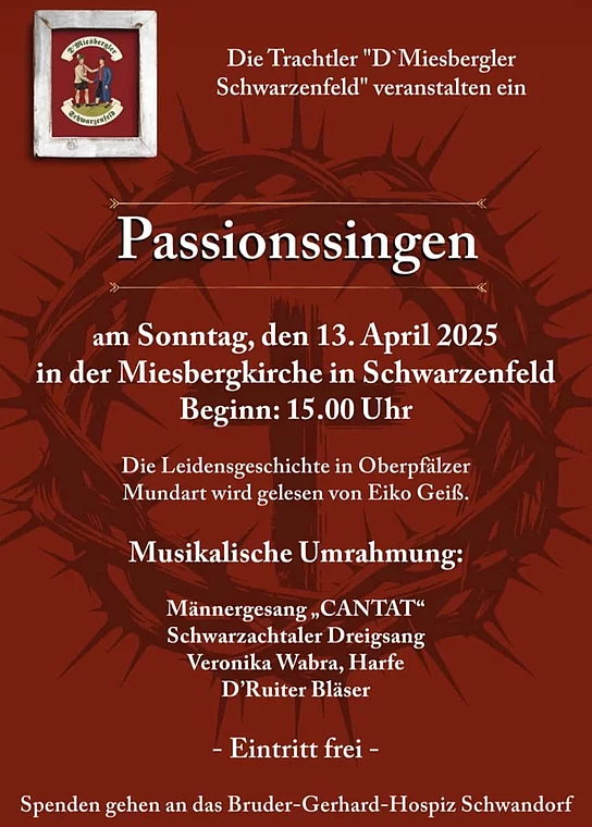 Der Trachtenverein "D'Miesbergler" lädt die Bevölkerung am Palmsonntag zum Oberpfälzer Passionssingen ein. Die Leidensgeschichte unseres Herrn Jesus Christus wird vorgetragen in Oberpfälzer Mundart durch Eiko Geiß. Zwischen den Texten singen und spielen der Männergsang "CANTAT", der Schwarzachtaler Dreigsang, Veronika Wabra (Harfe) und D'Ruiter Bläser. Der Eintritt ist frei. Spenden kommen dem Bruder-Gerhard-Hospiz in Schwandorf zugute.