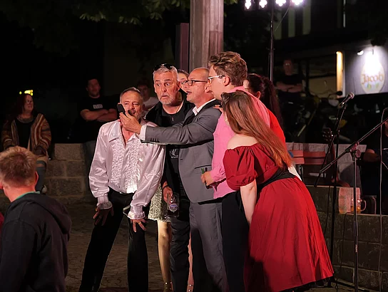 Offenbar hätte ER eine Hochzeitsband engagieren sollen und SIE hat sich auf IHN verlassen. Aber ER dachte, SIE würde das übernehmen. Der Bräutigam wendet sich in einem verzweifelten Aufruf an das Publikum: Gibt es hier Musiker, die innerhalb des 3-Gänge-Menüs ein Liebeslieder-Programm zusammenstellen, das die Braut mit ihrem Mann versöhnen würde?