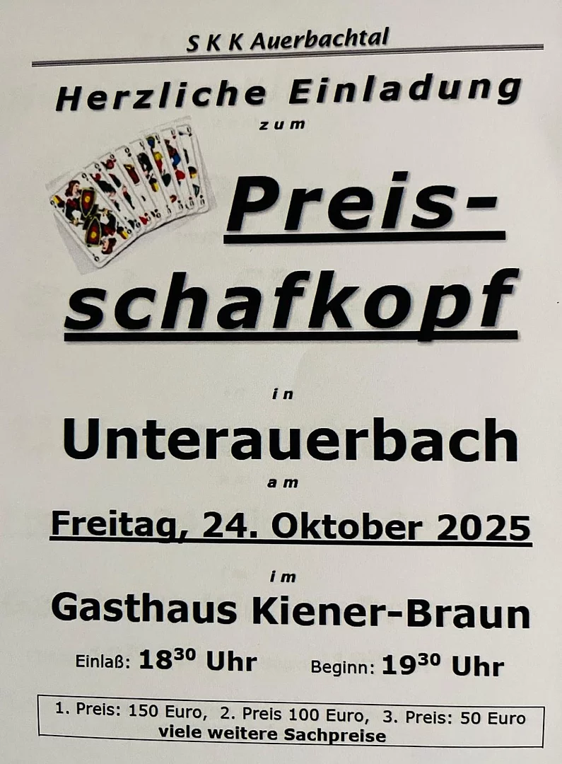Herzliche Einladung zum Preisschafkopf in Unterauerbach