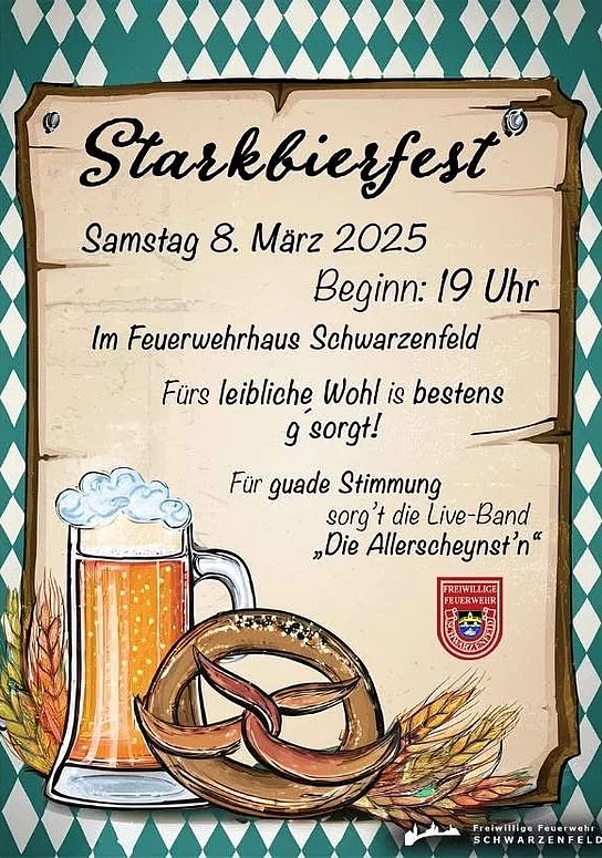 Die Freiwillige Feuerwehr Schwarzenfeld lädt herzlich zum traditionellen Starkbierfest am 08. März ab 19 Uhr in der Fahrzeughalle des Feuerwehrgerätehauses ein.