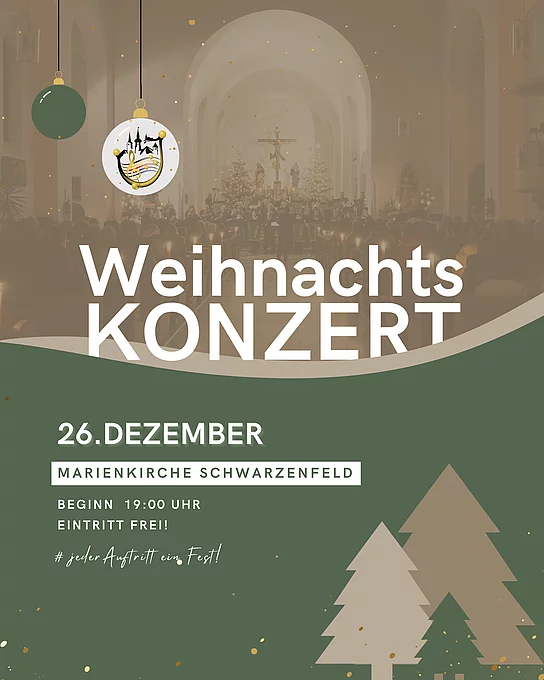 Wir laden Euch zum Jahresabschluss am zweiten Weihnachtsfeiertag, dem 26.12.2025, wieder zu unserem traditionellen Weihnachtskonzert ein. Lasst Euch ab 19:00 Uhr vom großen Blasorchester mit besinnlichen Stücken und sanften Klängen verzaubern. Nach dem Konzert steht vor dem Pfarrheim noch Glühwein und Punsch bereit, um die Adventszeit gemeinsam ausklingen zu lassen. Der Eintritt ist frei, um Spenden wird gebeten.