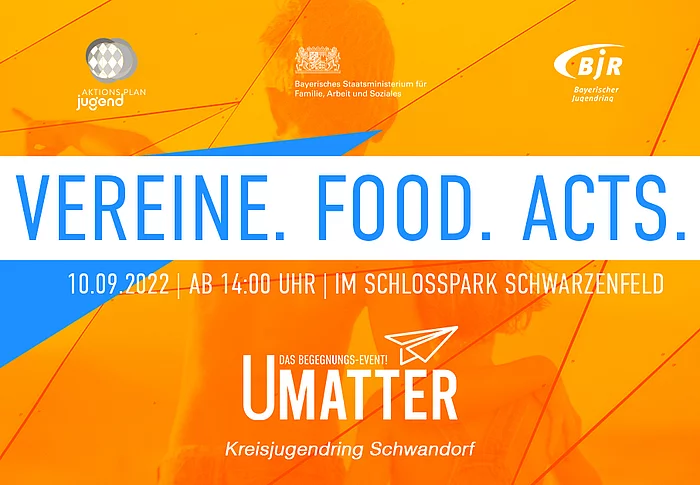 Am 10.09.2022 findet der landkreisweite Jugendtag statt! Von coolen Aktivitäts- und Street-Food-Ständen über eure Vereine (zum Vernetzen) bis hin zu Bands und DJs – Das ist UMatter! Freut euch auf einen ereignisreichen Tag im Schlosspark Schwarzenfeld.