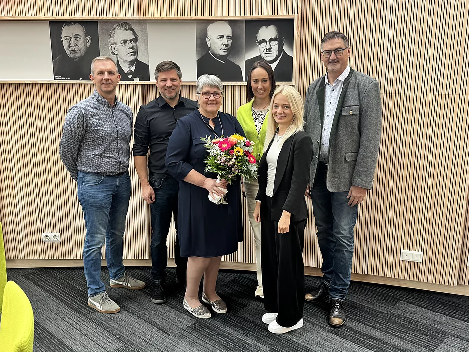 VG-Chef Peter Neumeier gratulierte im Namen der Verwaltungsgemeinschaft: „Elisabeth trägt mit ihrer großen Erfahrung im Erschließungs- und Beitragsrecht erheblich zum Gelingen der täglichen Abläufe bei. Sie war und ist z. B. die wesentliche Kraft hinter der örtlichen Umsetzung der Grundsteuerreform.“ Die drei Bürgermeister der VG-Mitgliedsgemeinden Peter Neumeier (Schwarzenfeld), Hans Prechtl (Stulln) und Michael Wilfahrt (Schwarzach b. Nabburg) dankten Elisabeth Fröhlich bei einer kleinen Feierstunde im Beisein von Geschäftsstellenleiterin Kathrin Schwarz und Ina Obermeier aus der Personalverwaltung.