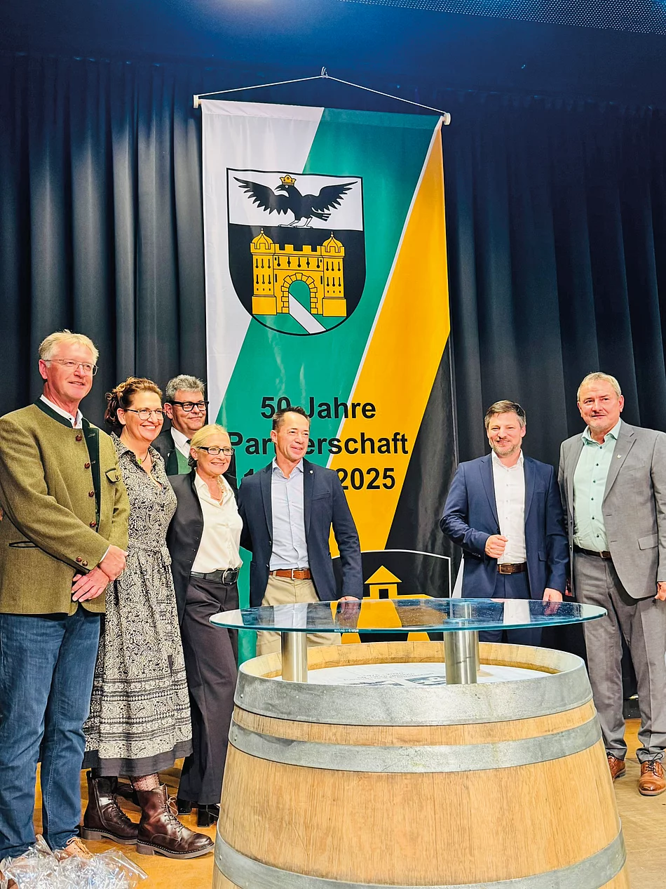 „50 Jahre gelebte Partner- und Freundschaft!“ So war das Jubiläumstreffen der Mandatsträger beider Orte, der von Straß in Steiermark und dem Markt Schwarzenfeld, überschrieben. Wie das seit dem Jahr 1977 in Regelmäßigkeit bei beiderseitigen Besuchen der Fall ist, hat sich Ende Oktober wiederum eine Delegation des Schwarzenfelder Marktrats samt Mitarbeiterinnen und Mitarbeitern des Rathauses auf Einladung der dortigen Gemeinde in der Südsteiermark eingefunden. Bereits im Jahr 1975 waren die ersten Verbindungen beider Orte aufgrund der Gemeinsamkeit der damaligen Postleitzahlen 8472 zustande gekommen. Der damalige steierische Postamtsleiter Karl Lutz und Ludwig Ettl von der Poststelle in Schwarzenfeld sind aufgrund wiederholter Verwechslung bei der Zustellung auf die Idee gekommen, eine Partnerschaft ins Leben zu rufen. Gleichzeitig wurde der amtliche Beschluss dazu bei den Räten gefasst und der Grundstein für eine tragende Verbindung bis jetzt über ein halbes Jahrhundert gelegt. Herzlichkeit mit teils tiefgreifenden Freundschaften bestimmen seitdem die Treffen beider Gremien mit ihren Familien. Es sind aber nicht nur die Mandatsträger, die einen besonderen Draht aufrecht erhalten. Bei diversen Vereinen hat sich zwischenzeitlich eine mehr als kameradschaftliche Verbindung ergeben. „Egal, ob man bei einem Glas Wein an der Bar steht, oder heute beim Galaabend in offizieller Funktion beieinander sitzt, das Miteinander ist getragen von Freundschaft und Freude“ beschrieb Bürgermeister Johann Lappi aus Straß eingangs seiner Begrüßung zum Festabend die lang anhaltende Verbindung. Einmal in jeder Wahlperiode findet ein Besuch der jeweiligen Gemeindevertreter gegenseitig statt. „Aufgrund der Pandemie konnte sich das aktuelle Marktratsgremium erst kurz vor den Neuwahlen zum ersten Mal zum Partnerschaftstreffen in Straß einfinden“, klärte Bürgermeister Peter Neumeier auf. Als ein „gewisses Heimkommen“ bezeichnete Neumeier den herzlichen Empfang und das Zusammentreffen mit Freunden in der sonnigen Steiermark. Wie es bei solchen Anlässen üblich ist, wurden Erinnerungsgeschenke ausgetauscht. Mit einem überdimensionalen Weinfass, umgestaltet als Stehtisch, wartete Bürgermeister Lappi auf, während die Schwarzenfelder Delegation mit bunten Stapelsteinen für die örtlichen Kindergärten vor allem die anwesenden Betreuungskräfte begeisterte. Mit einem Besuch des Attemsmoores, einem neu geschaffenen Naturpark-Juwel und der Besichtigung der neu erbauten Fußgängerbrücke über die Mur, als Verbindung zwischen der Steiermark und Slowenien, war ein ansprechendes Programm geboten. Natürlich durfte eine Fahrt durch die „Steirische Toskana“, über die sonnige Weinstraße nicht fehlen. Mit einem lautstarken „Kummts wieda“ wurden die Schwarzenfelder verabschiedet, nicht ohne Gegeneinladung zum nächsten Treffen in zwei Jahren.