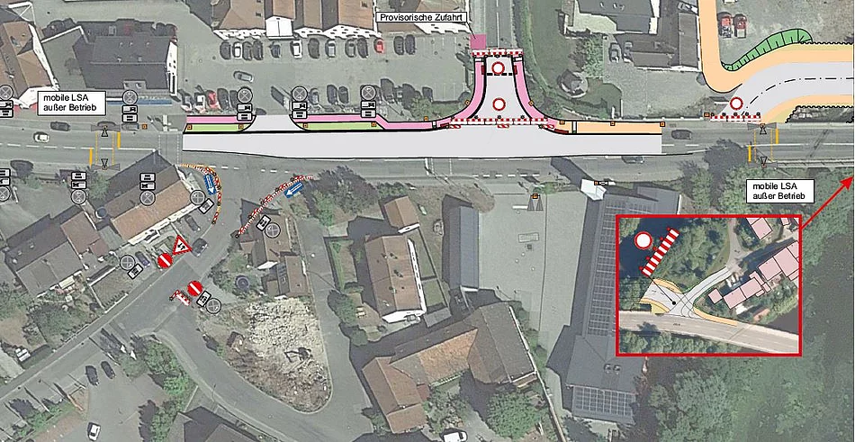 Die erste Vollsperrung der Staatsstraße im Zuge der Erneuerung der Kleinen Naabbrücke in Schwarzenfeld vom 15. bis 20.08.2023 ist geschafft. Das Bauprojekt geht nun vom 21.08. bis 11.09.2023 in eine Zwischenphase. In dieser Zeit werden die Arbeiten an der Behelfsbrücke und deren Zuführungen fortgeführt. Die Staatsstraße bleibt in dieser Zeit zweispurig und ohne Ampel befahrbar. Allerdings bleibt die Einmündung in die Hauptstraße voll gesperrt und die Einmündung in die Morgenlandstraße wie bisher nur als Einbahnstraße nach Süden, also zum Rewe hin, offen. Dies begründet das Staatliche Bauamt damit, dass die Ampelanlage in diesem Knotenpunkt aktuell nicht betrieben werden kann. Da sie teilweise abgebaut ist, können nicht alle Verkehrsbeziehungen konfliktfrei aufrechterhalten werden. Um den Baustellenverkehr und den öffentlichen Verkehr möglichst unfallfrei abwickeln zu können und Rückstau auf die Autobahn zu vermeiden, wurde deshalb entschieden, die Verkehrsführung in dieser Zwischenphase wie in der Skizze dargestellt zu gestalten. Nach der Zwischenphase wird voraussichtlich ab 12.09.2023 eine nächste halbseitige Sperrung im Kreuzungsbereich nötig.