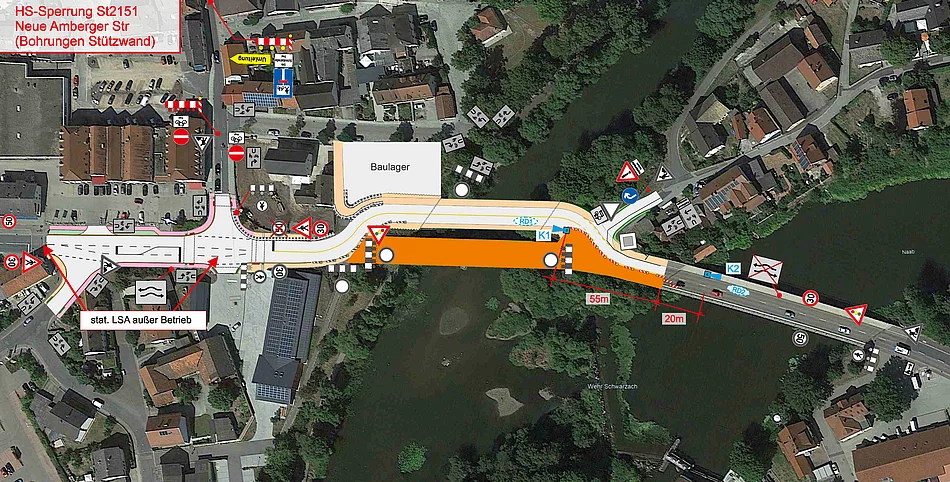 Ende Februar hatten wir bereits über die kommende Vollsperrung der Staatsstraße 2151 dieses Wochenende, 15.03.2024 ab 20 Uhr bis Montag, 18.03.2024 ca. 5 Uhr, im Zuge der Brückenbaustelle informiert. Vor Kurzem hat uns nun das Staatliche Bauamt in Kenntnis darüber gesetzt, dass es direkt im Anschluss zu einer halbseitigen Sperrung kommen wird, vom 18.03.2024 bis zum 22.03.2024. Details sind der Skizze zu entnehmen. Die Engstelle befindet sich zwischen großer und kleiner Naabbrücke. Hier müssen an einer Stützmauer Bohrungen gemacht werden. Auch bei der halbseitigen Sperrung ist leider mit erheblichen Beeinträchtigungen für den Verkehr zu rechnen. Die Ampel an der Einmündung der Hauptstraße wird abgeschaltet und eine Baustellenampel am Beginn der Behelfsbrücke aufgebaut. Das Einbiegen vom Badeanger in die St 2151 ist während der halbseitigen Sperrung nur in Fahrtrichtung ortseinwärts erlaubt. Das Abbiegen von der St 2151 in den Badeanger ist aus beiden Fahrtrichtungen möglich. Das Einbiegen von der Hauptstraße in die St 2151 ist während der Maßnahme nicht zugelassen. Diese Fahrtrichtung wird am Platz am Kreuz umgeleitet. Wer aus Richtung Sportpark / Stulln zur Brücke muss, fährt bitte möglichst über die Böttgerstraße und dann am Gewerbegebiet auf die Amberger Straße. So wird der Ortskern entlastet. Das Abbiegen von der St 2151 in die Hauptstraße ist aus beiden Fahrtrichtungen möglich. Wegen der außer Betrieb genommenen Ampel wird im Bereich zwischen Morgenlandstraße und Hauptstraße ein Tempolimit von 30 km/h angeordnet, um Fußgängern das Queren zu ermöglichen.