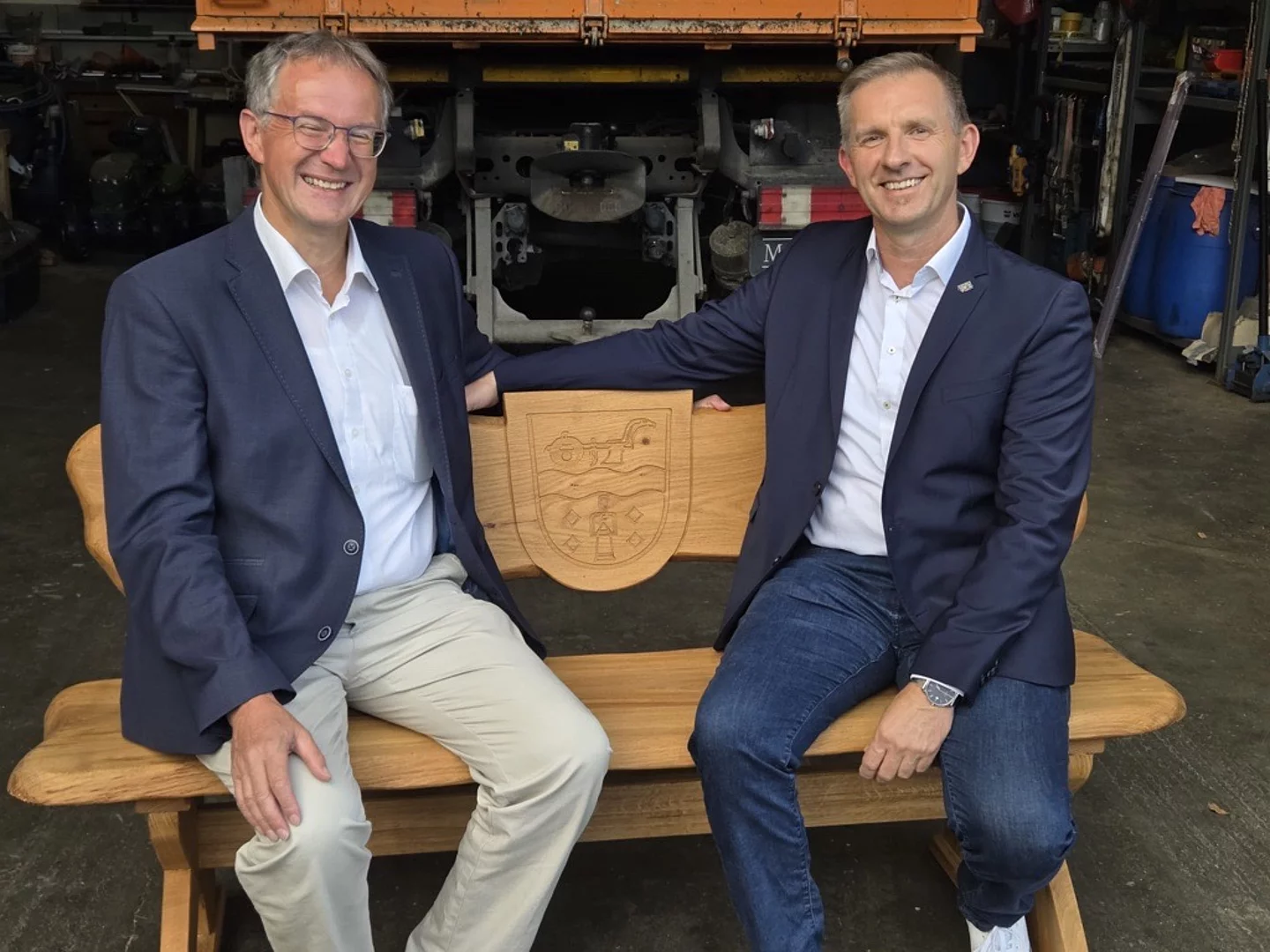 Über die von Holzkunst Lehner gefertigte Bank verziert mit Gemeindewappen freute sich Grabinger sichtlich sehr. Er hatte sein Amt zum Jahresende 2024 aus gesundheitlichen Gründen niedergelegt. Aus der folgenden Urwahl ging im März Michael Wilfahrt als Bürgermeister hervor. Seine Amtszeit dauert bis 2032.