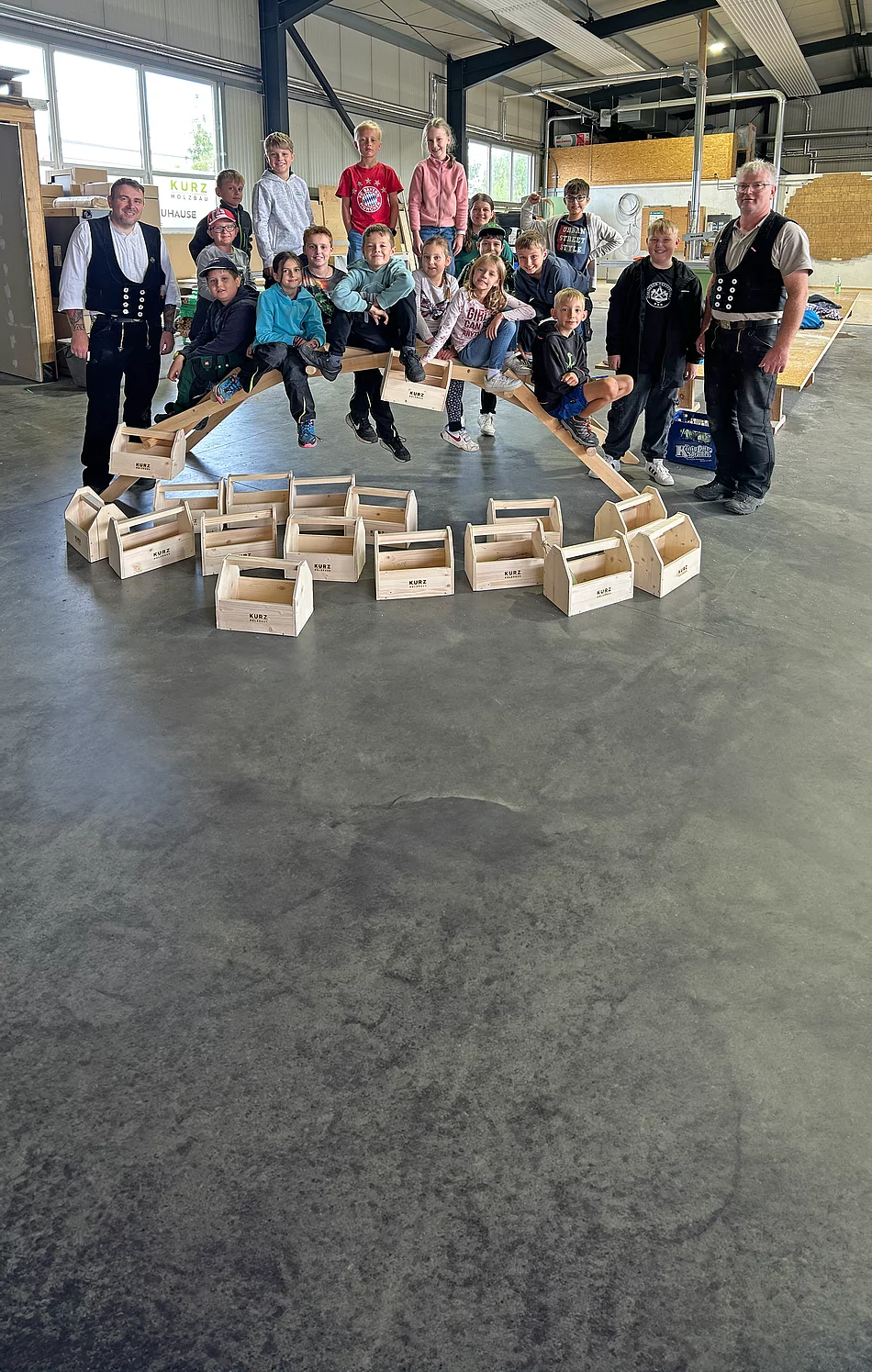 Eine Premiere gab es bei Kurz Holzbau: 16 Mädchen und Buben zwischen 7 und 15 Jahren bauten ihre eigenen Werkzeugkisten und lernten dabei den Werkstoff Holz aus nächster Nähe kennen. Höhepunkt des Tages war der Bau einer sogenannten Leonardo-Brücke – einer Konstruktion, die ohne Schrauben, Nägel oder Leim auskommt und allein durch das geschickte Ineinanderstecken der Hölzer stabil wird. Mit Teamgeist und Konzentration gelang es den Kindern, das Bauwerk erfolgreich aufzurichten – ein sichtbares Zeichen dafür, was man gemeinsam schaffen kann.