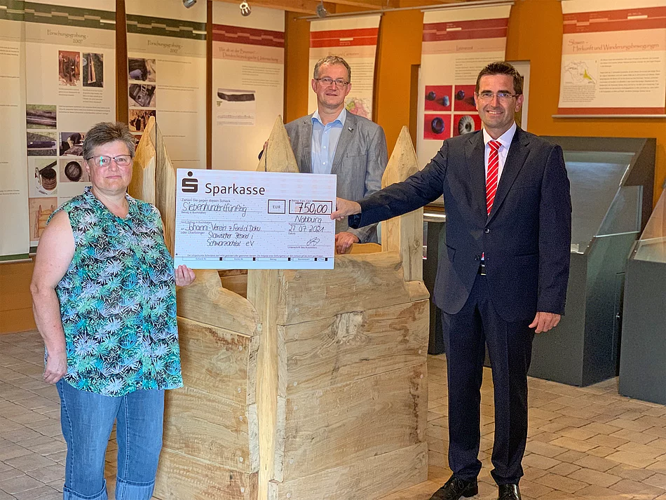 Der Verein, der das Dokumentationszentrum über die slawische Besiedelung im Schwarzachtal in der Johannihütte bei Weiding betreibt und ansonsten für seine Fest-Highlights, wie den „Hüttenzauber“, das Weinfest oder das Johannifest, bekannt ist, erhielt von der Sparkasse im Landkreis Schwandorf eine Spende über 750 Euro. Die aus dem Kultur-Etat der Sparkasse stammende Förderung sei dieses Mal höher als gewöhnlich ausgefallen. Damit wolle man die negativen Pandemie-Effekte, die auch und gerade Vereine beträfen, abmildern helfen, so Günter Süß, Gebietsdirektor für den Altlandkreis Nabburg, bei der symbolischen Scheckübergabe. Bürgermeister Franz Grabinger sprach im Namen der Gemeinde seinen Dank aus und lobte das große ehrenamtliche Engagement und das Herzblut der Vereinsmitglieder und insbesondere der Vorstandschaft rund um die Vorsitzende Sabine Stangl. Das Dokumentationszentrum ist auf Anfrage stets offen für Gruppen- und auch Schulklassenbesuche samt Führungen. Jeden Sonntag ist regulär von 10 bis 12 Uhr inklusive Gastronomie geöffnet.