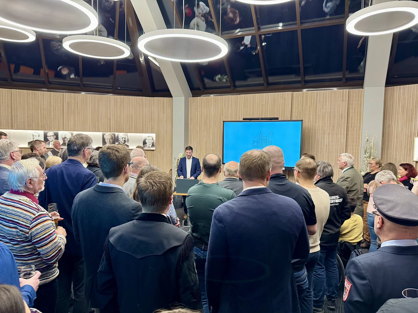 Eine Veranstaltung, wie sie heute, wie sie jetzt gerade in diesem Augenblick hier im großen Sitzungssaal unseres Rathauses stattfindet, soll jetzt zu Beginn des Jahres in festlichem Rahmen Gemeinschaft demonstrieren. Es soll heute bei der Zusammenkunft von tragenden Säulen unseres Heimatortes in Bezug auf das kommunale Ehrenamt, in Bereichen wirtschaftlichen und sozialen Engagements, aber auch kultureller Belange einen gewissen Reichtum für eine Kommune aufzeigen. Mir ist bewusst, dass die Zahl derer, die sich im Vereinsleben der über siebzig etablierten Vereine, derer, für die Gemeinwohl ein starkes Gut darstellt, weit größer ist, als die Anzahl der hier Versammelten. Ein Festabend, der mit dem Titel „Neujahrsempfang“ überschrieben ist, bietet neben dem Vortrag des Bürgermeisters, verbunden mit dem Dank für das im abgelaufenen Jahr Geleistete, auch Raum für ein Miteinander im Gespräch, für den Austausch und das Kennenlernen. Diese besondere „Bühne“, wenn ich sie so nennen darf, kann allerdings auch dazu dienen, besonderes und außergewöhnliches Engagement aus dem Alltag herauszuheben, ja mit einem gewissen Glanz darzustellen.