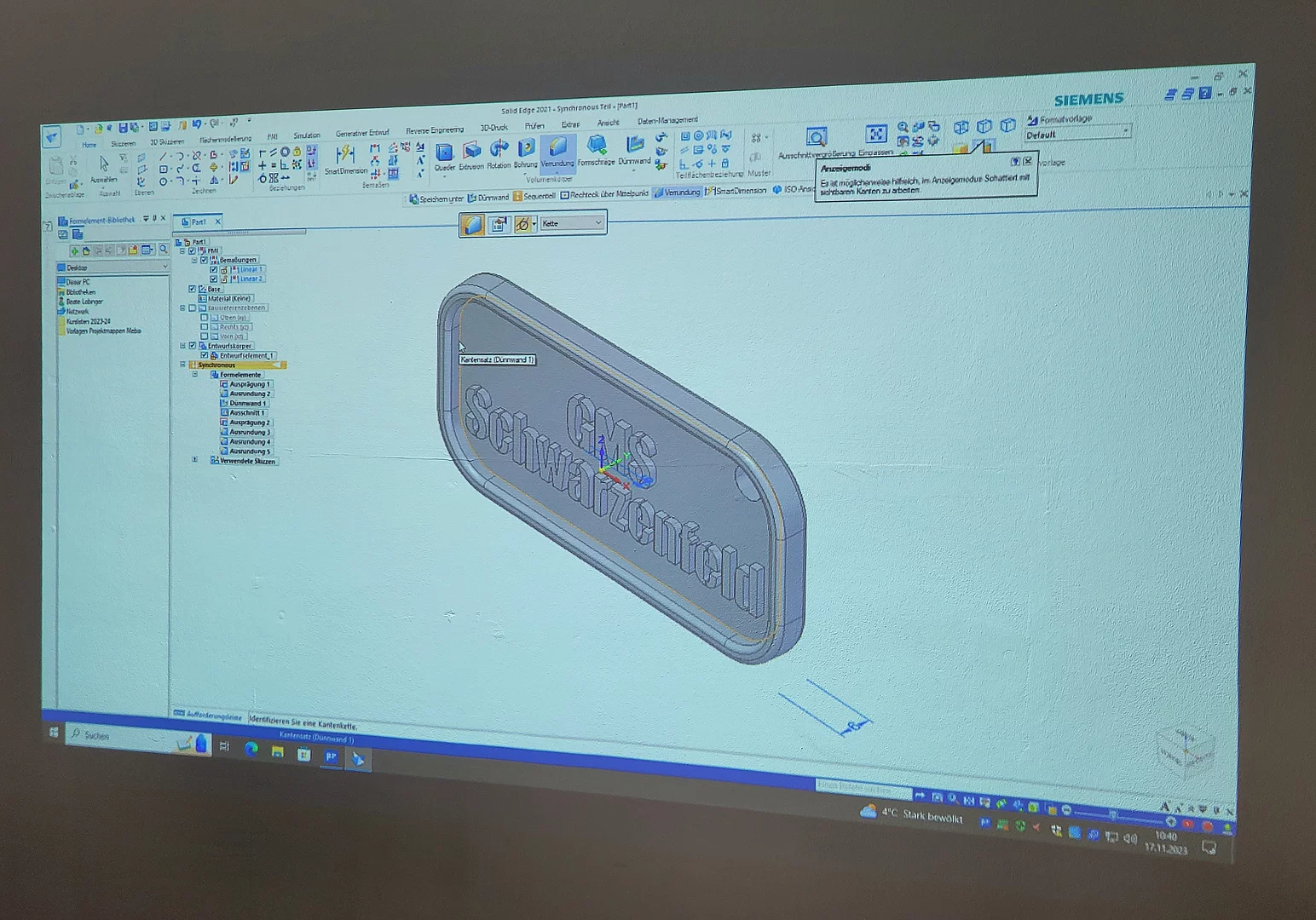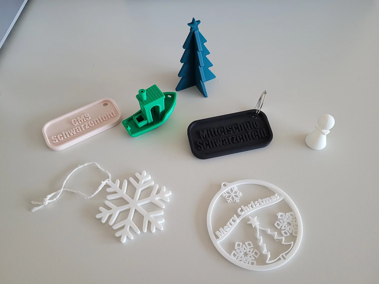 Die Technik-Gruppen der 8. und 9. Klasse haben schon verschiedene Projekte mit dem 3-D-Drucker umgesetzt. Schlüsselanhänger, Einkaufswagenlöser, Spielfiguren und Stiftehalter wurden mit dem CAD-Programm gezeichnet und dann ausgedruckt. Außerdem erstellten sie Tannenbäume und Anhänger für den Weihnachtsverkauf.