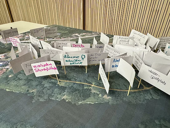 Die inhaltliche Arbeit leitete Stadtplanerin Barbara Wilnhammer vom Büro Wild & Wilnhammer Architekten und Stadtplaner. An drei Stationen sammelten die Teilnehmenden Ideen, markierten Bereiche auf Plänen und setzten Klebepunkte zur Gewichtung der Vorschläge.