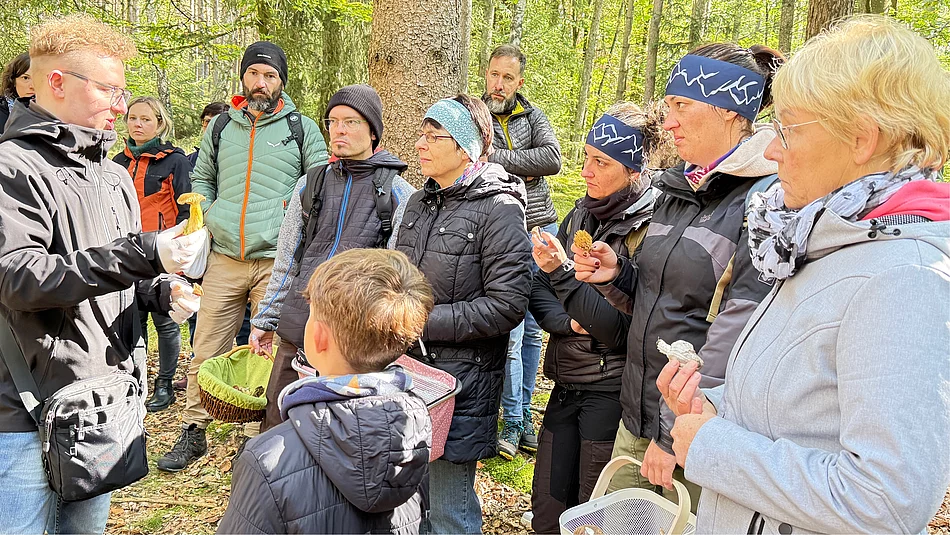 Es war einer der Termine, der sofort nach Ankündigung ausgebucht war. Bei bestem Schwammerlwetter konnte Hunzinger am Waldrand bei Asbach über 40 Interessenten begrüßen, die mehr über die Welt der heimischen Pilze erfahren wollten. Im Laufe der etwa dreistündigen Wanderung lernten die Teilnehmenden nicht nur viel über essbare und giftige Arten, sondern auch über die ökologische Bedeutung von Pilzen als Zersetzer und Symbiosepartner im Wald. Nach einer kurzen Einführung in die Grundlagen der Pilzkunde, darunter die Unterscheidung zwischen Hutpilzen, Röhrlingen, Lamellenpilzen und Vitalpilzen, startete die Wanderung in Richtung Thundorfer Weiher. Bereits wenige Schritte nach dem Aufbruch wurden die ersten Pilze entdeckt, was sofort für Begeisterung bei Groß und Klein sorgte. Denn Pilze zu suchen und zu finden, macht nicht nur Spaß, sondern schärft auch den Blick für die Natur.