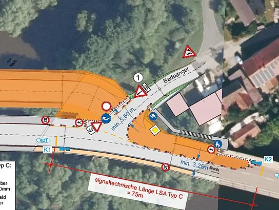Zunächst wird es vom 27. März bis 07. April eine halbseitige Sperre mit Ampelregelung östlich der Badeanger-Einmündung geben, um den Gehweg auf der Nordseite herstellen zu können. Der Badeanger bleibt für PKW und Fußgänger erreichbar.