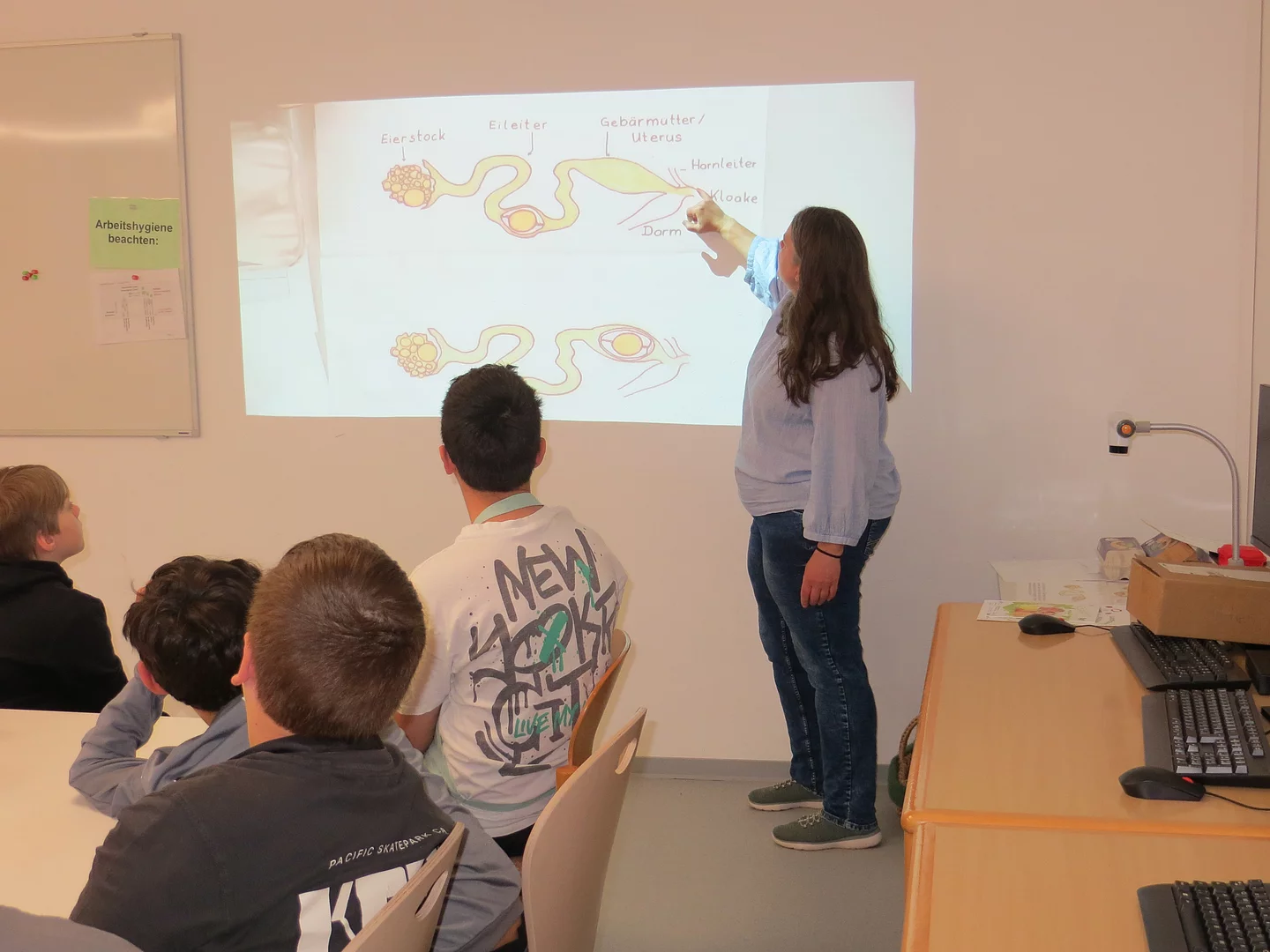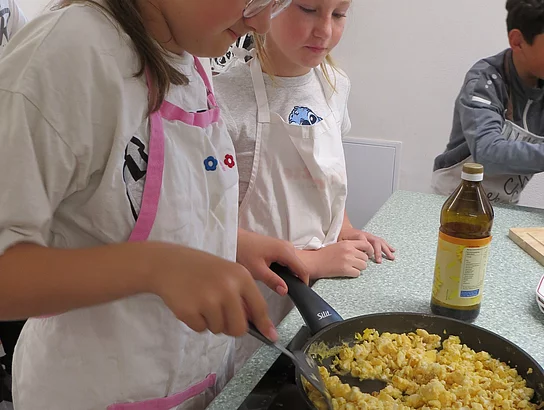 Erlebnisbäuerin Daniela Schönberger besuchte unsere Schule an drei Vormittagen, um den Kindern den „Weg vom Huhn zum Ei“ anschaulich und praxisnah zu vermitteln. Im Mittelpunkt stand dabei die gemeinsame Zubereitung eines Rühreies, das mit frischem Schnittlauch und Butterbrot nicht nur genussvoll verzehrt wurde, sondern auch Anlass bot, wichtige Hygiene- und Verhaltensregeln in der Küche kennenzulernen – ganz im Sinne einer gesunden und nachhaltigen Ernährung.