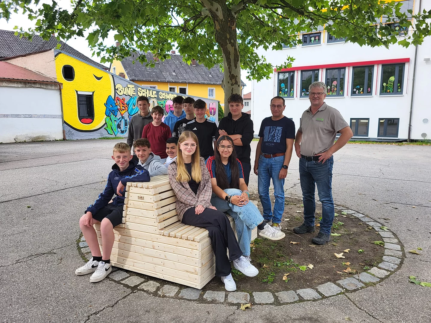 Zusammen mit einer Auszubildenden und dem Geschäftsleiter Richard Kurz wurde eine Sitzbank für die Schule gebaut.