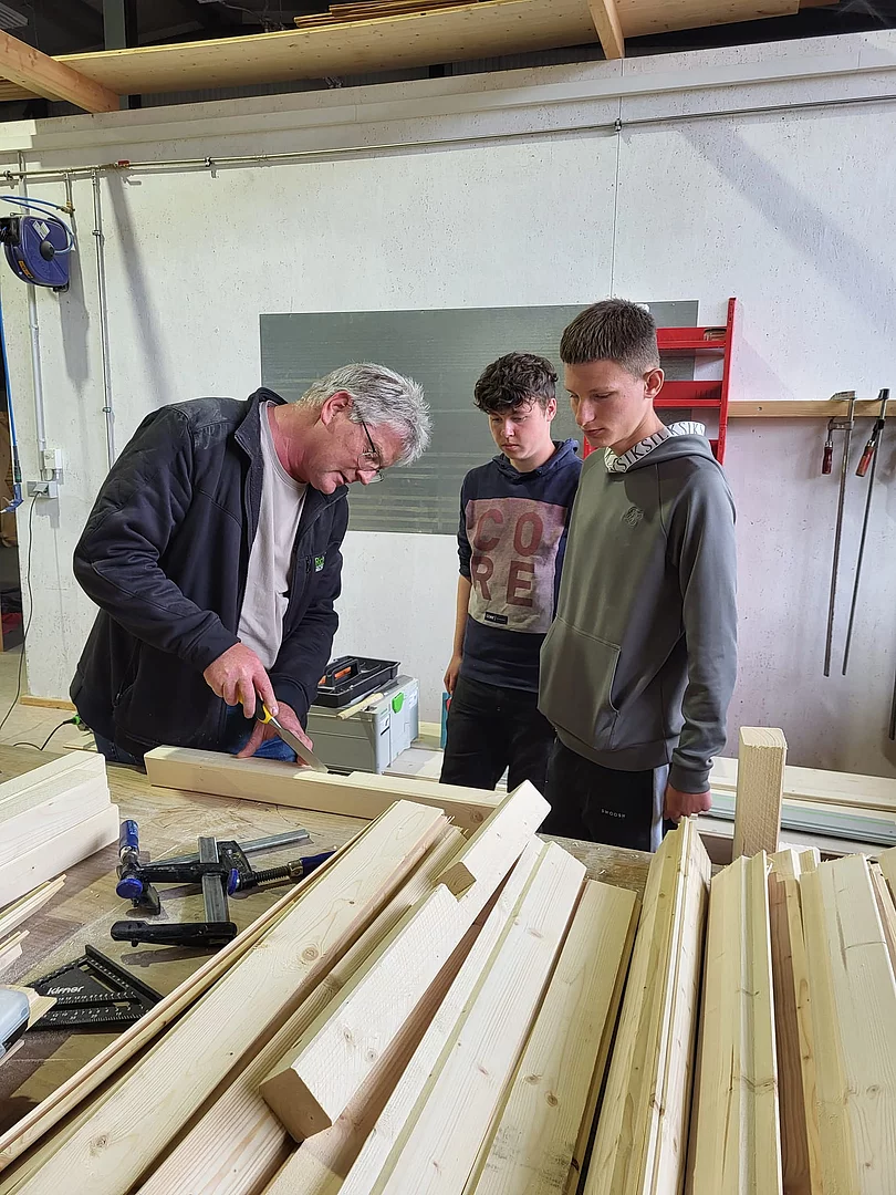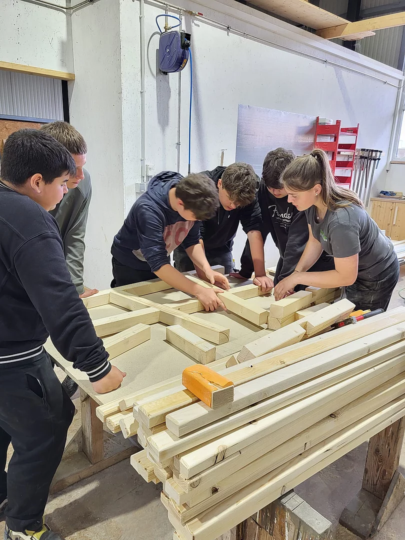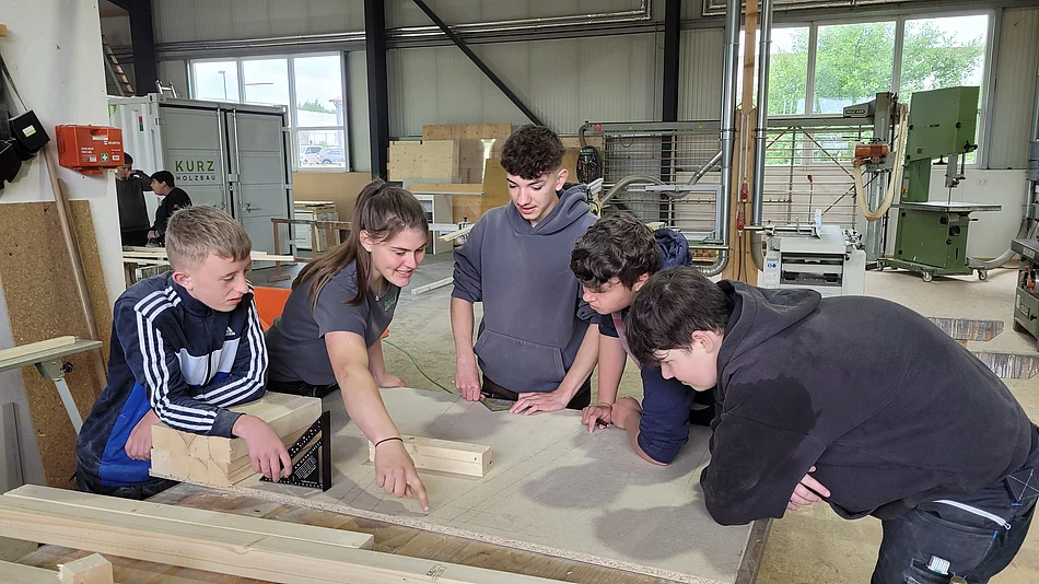 Im Rahmen eines „Praxis an Mittelschulen-Projekts“ besichtigte die Technik-Gruppe der 7. Klasse bereits im April den Betrieb Holzbau Kurz. Jetzt folgte der Praxistag für die 8. Klasse im Unternehmen.