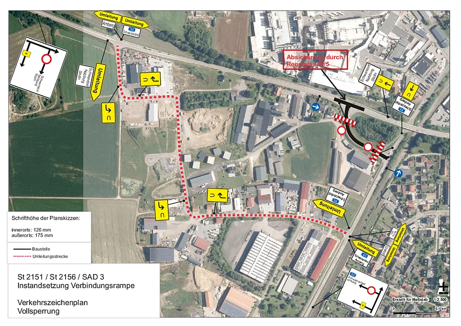 Das Staatliche Bauamt Amberg-Sulzbach informiert, dass an der Verbindungsrampe zwischen der St2151 und der St2156 (Verbindung zw. der Amberger Straße und der Böttgerstraße) Schadstellen saniert werden müssen. In diesem Zuge muss die Verbindungsrampe vom 31.05.2023 bis 03.06.2023 für den Verkehr gesperrt werden. Die Umleitungsstrecke führt durch das Industriegebiet über die Ohmstraße und die Max-Planck-Straße. Einzelheiten sind der Skizze unter Downloads zu entnehmen. Die Verwaltung bittet die Verkehrsteilnehmer und Gewerbetreibenden entlang der Umleitungsstrecke um Verständnis.