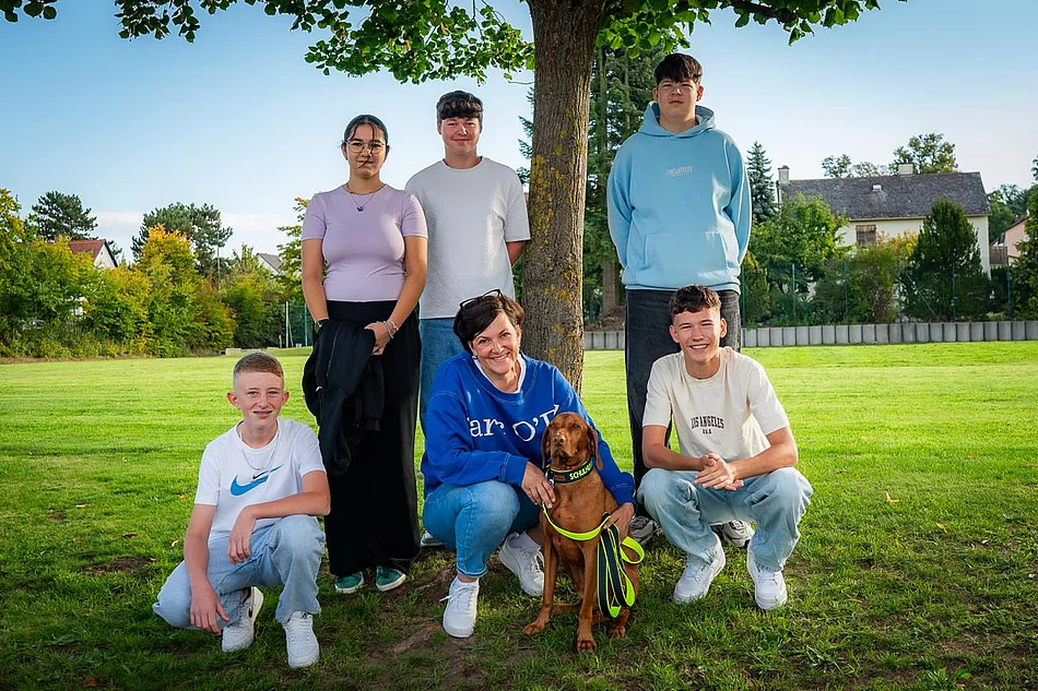 Seit dem Sommer 2025 bereichert ein ganz besonderes Mitglied unseren Schulalltag: Schulhund Nadir. Gemeinsam mit seiner Hundeführerin und Klassenleiterin Frau Uta Prechtl hat er erfolgreich eine spezielle Ausbildung zum Schulhund absolviert und ist seit Juli 2025 fester Bestandteil des Unterrichts in ihrer Klasse.
