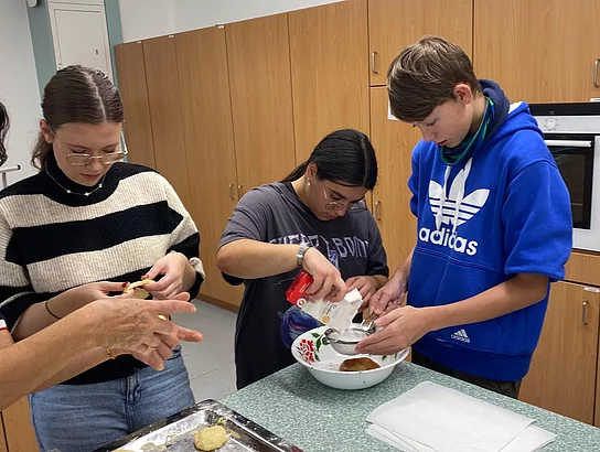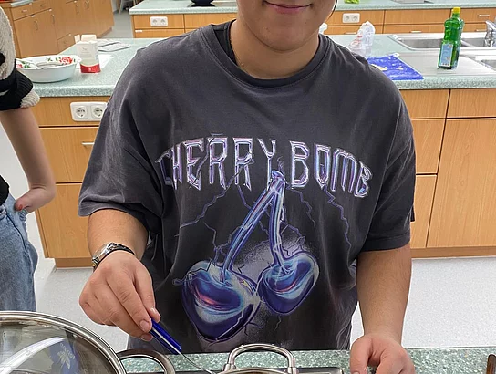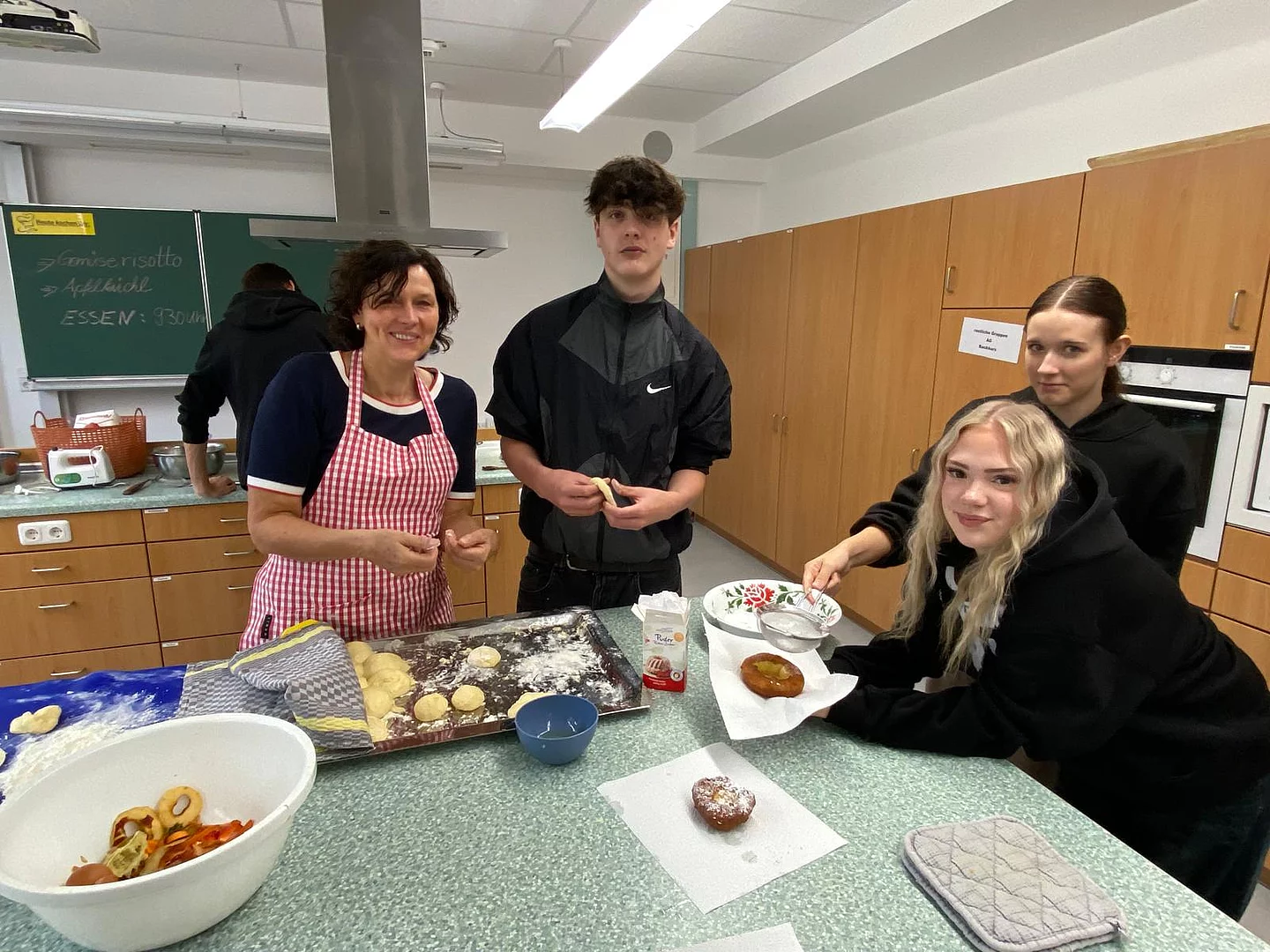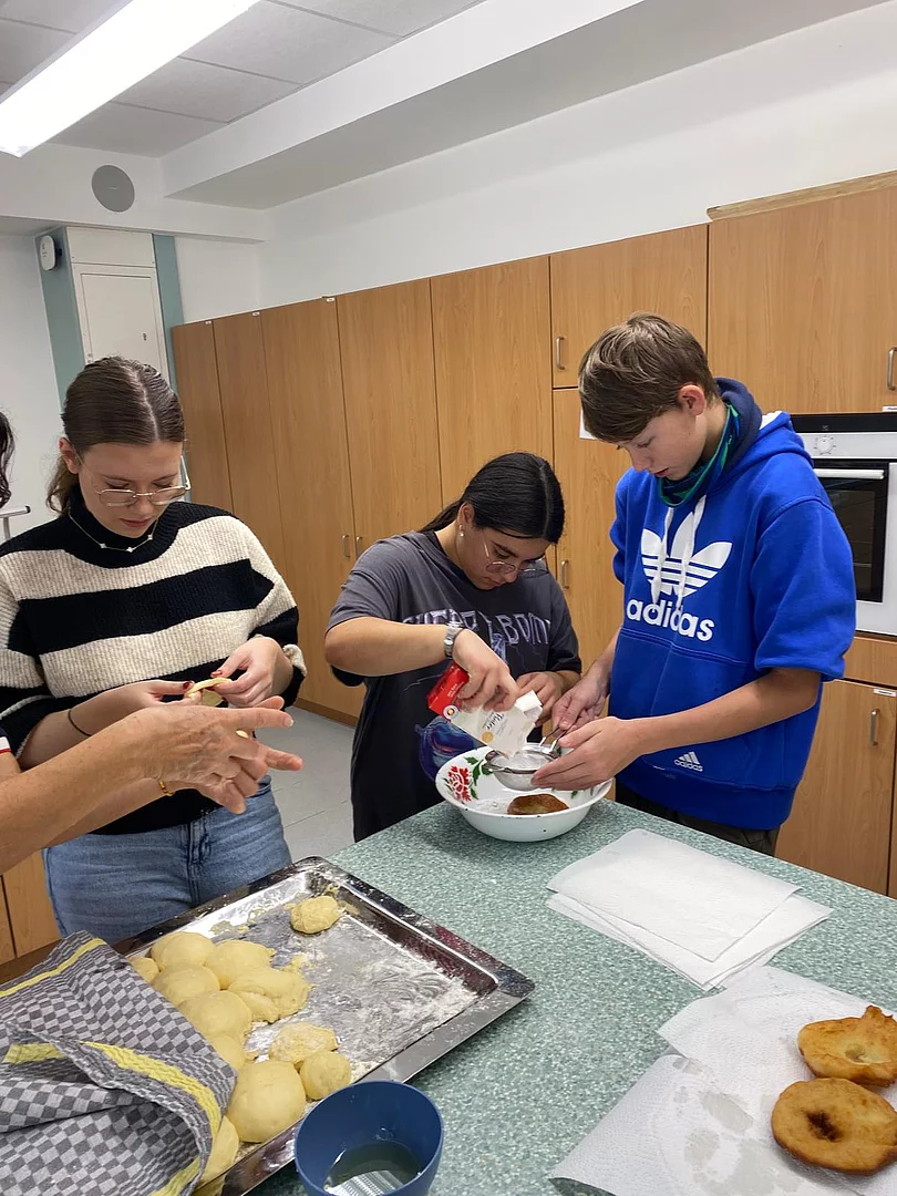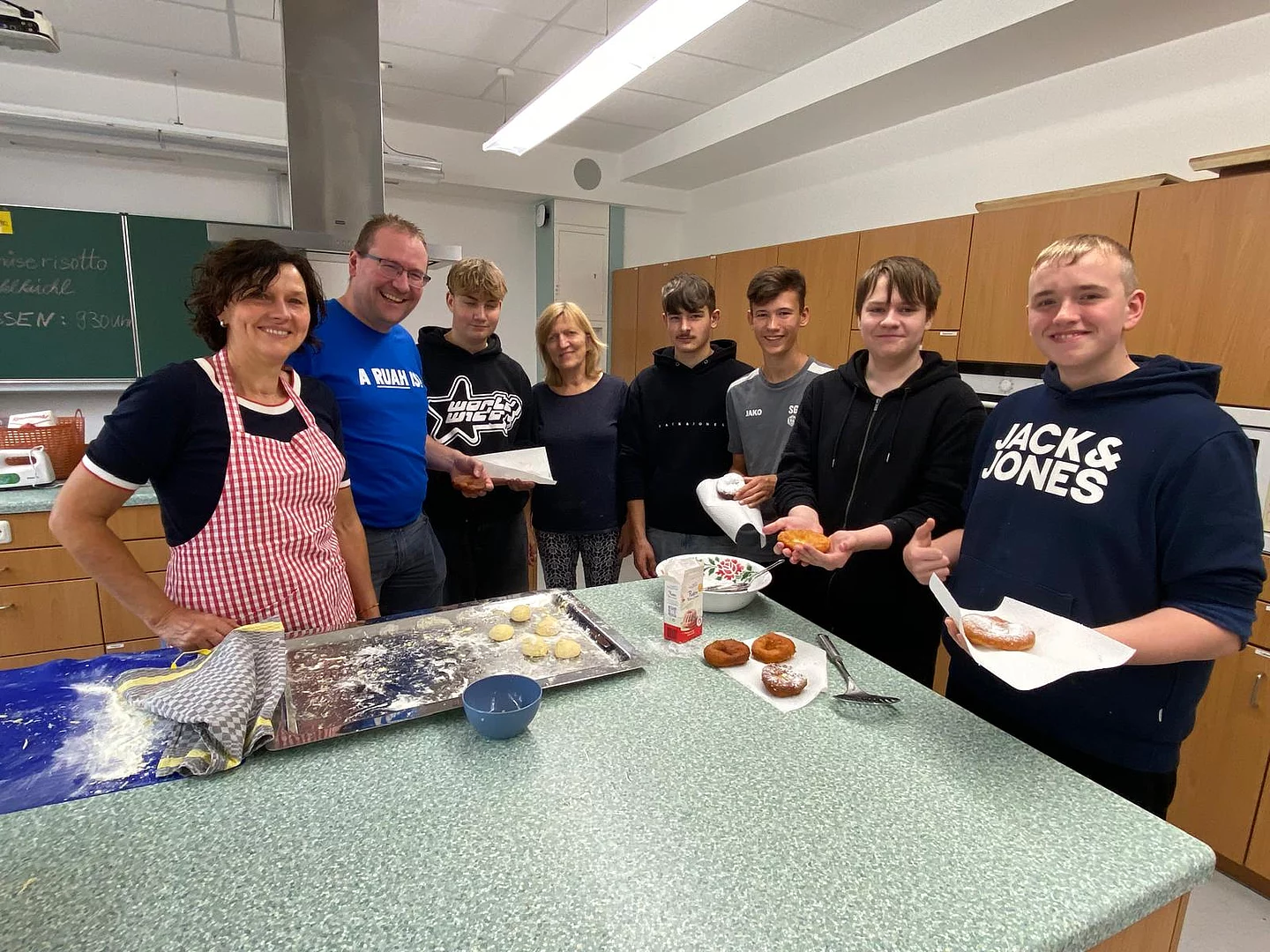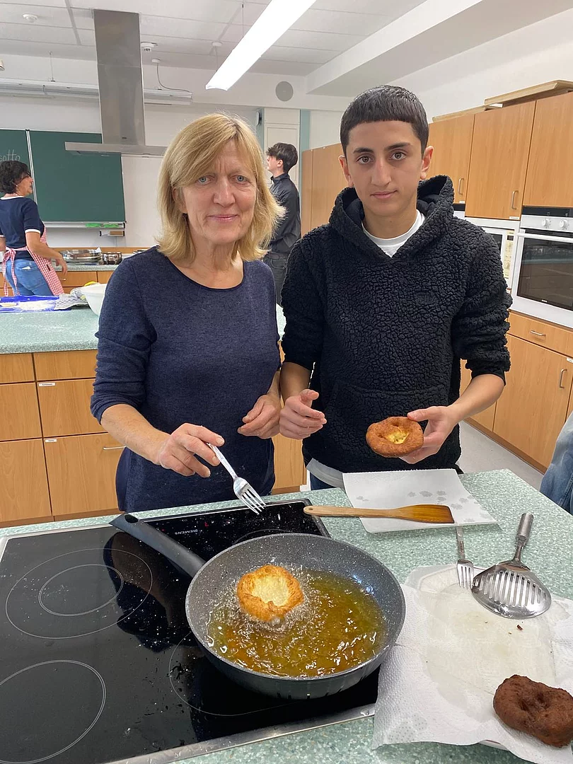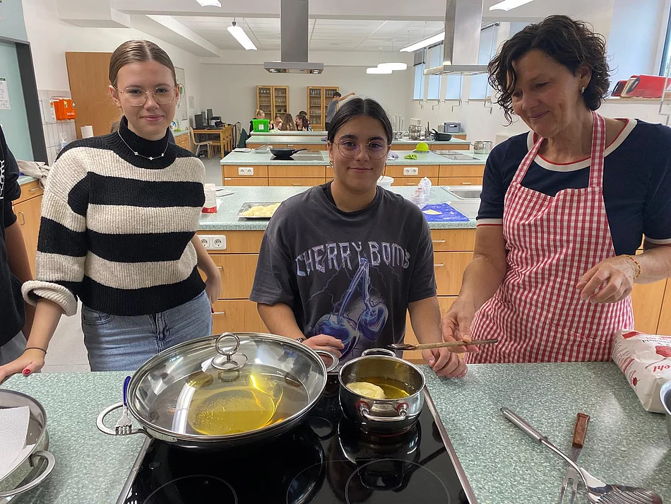 Schnell stellten die Schüler der Klassen 8 und 9 fest, dass „Kiachldrahn“ und „Ausbacka“ wie so manches eine Wissenschaft für sich ist und gelernt sein will. Dem stellten sie sich und „drahten“ in der Schulküche unter der Anleitung ihrer Lehrerin Frau Ruhland und den Kiachlbackerinnen Frau Hösl und Frau Schuster ihre ersten „Keichln“, um sie dann selbst im heißen Fett auszubacken und mit Puderzucker zu bestreuen. Wenn manche Kiachln auch nicht ganz so aussahen wie die von der Oma – sie schmeckten hervorragend und jeder „glangte“ gerne zu!
