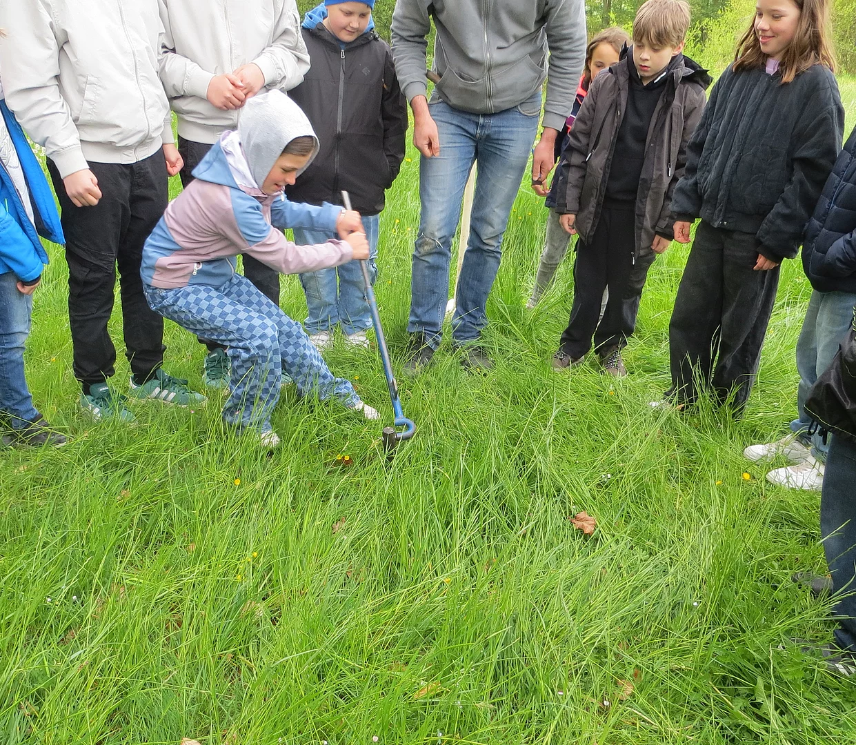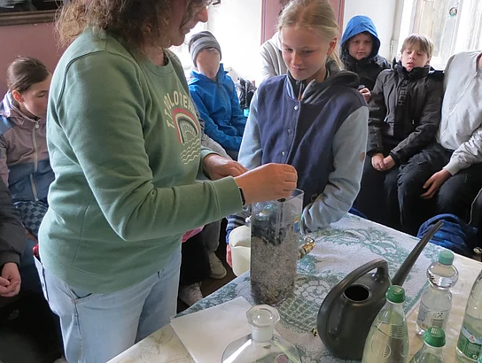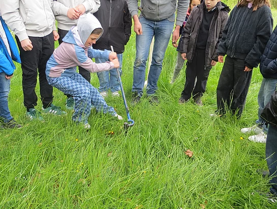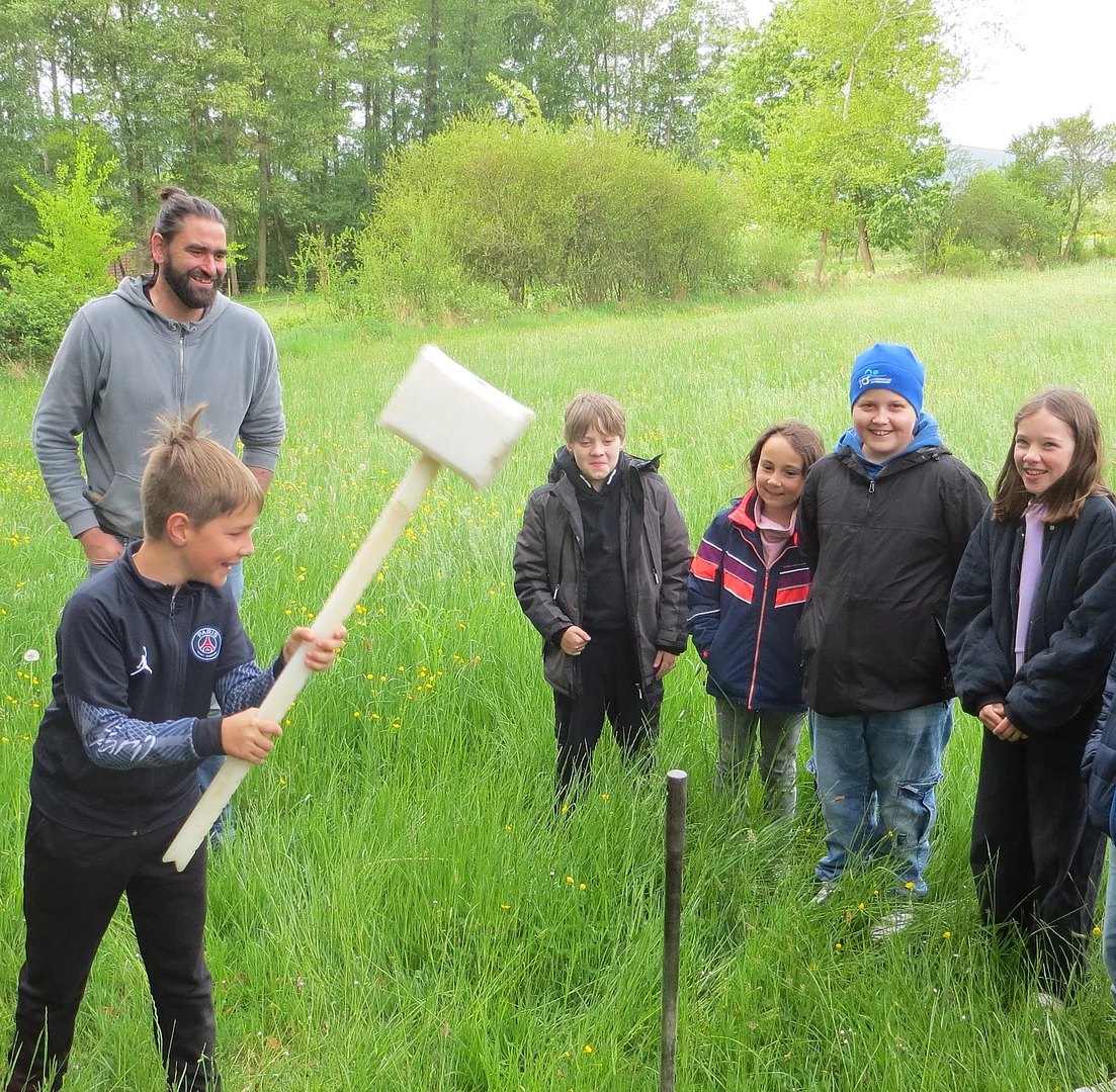 Besonders beeindruckend war die Station „Bodenschutz“, betreut von derUmweltstation KTB und dem Landesamt für Umwelt.Hier wurde den Kindern bewusst gemacht, wie wichtig gesunder Boden als Lebensgrundlage und als Teil des Wasserkreislaufs ist. Als Highlight dieser Station durften die Schülerinnen und Schüler sogar ihre Kräfte unter Beweis stellen, da sie mit einem Hammer einen Pürckhauer-Bohrer zur Bodenprobenentnahme in den Boden schlagen sollten.