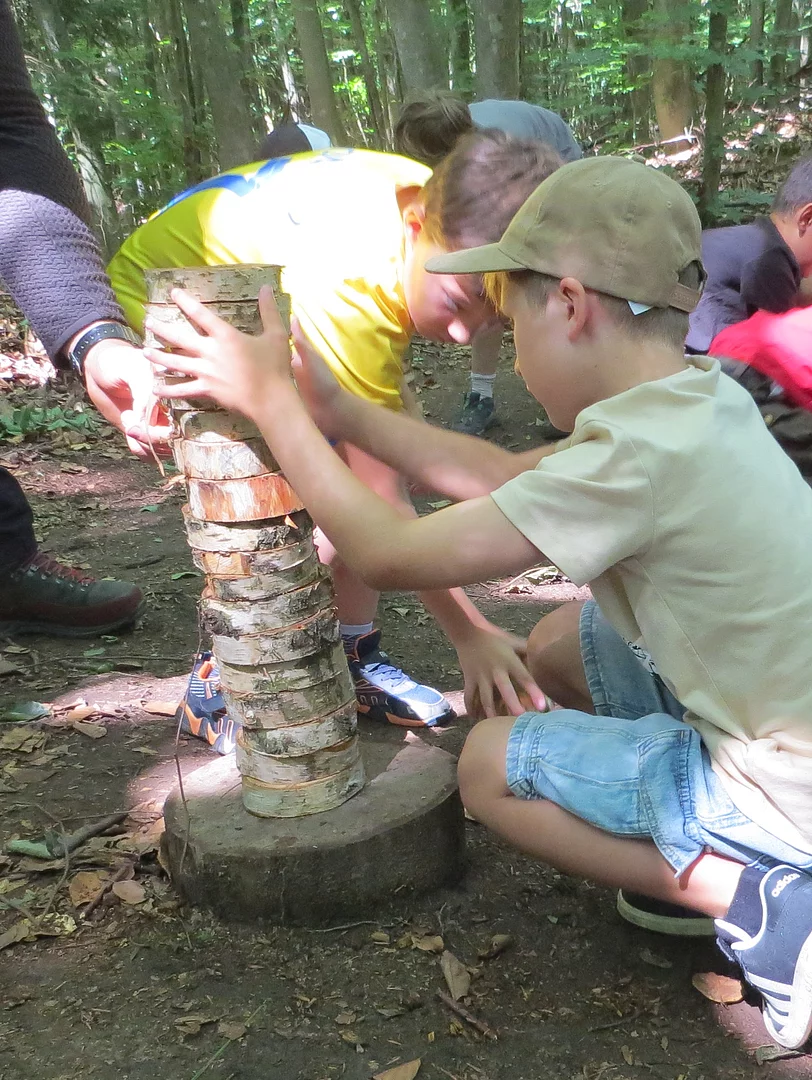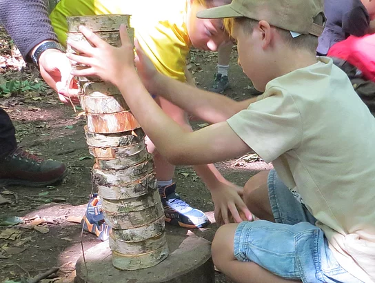 • Turmbau: Eine Gruppe von 16 Kindern arbeitete gemeinsam an vier Türmen aus Rindenscheiben.