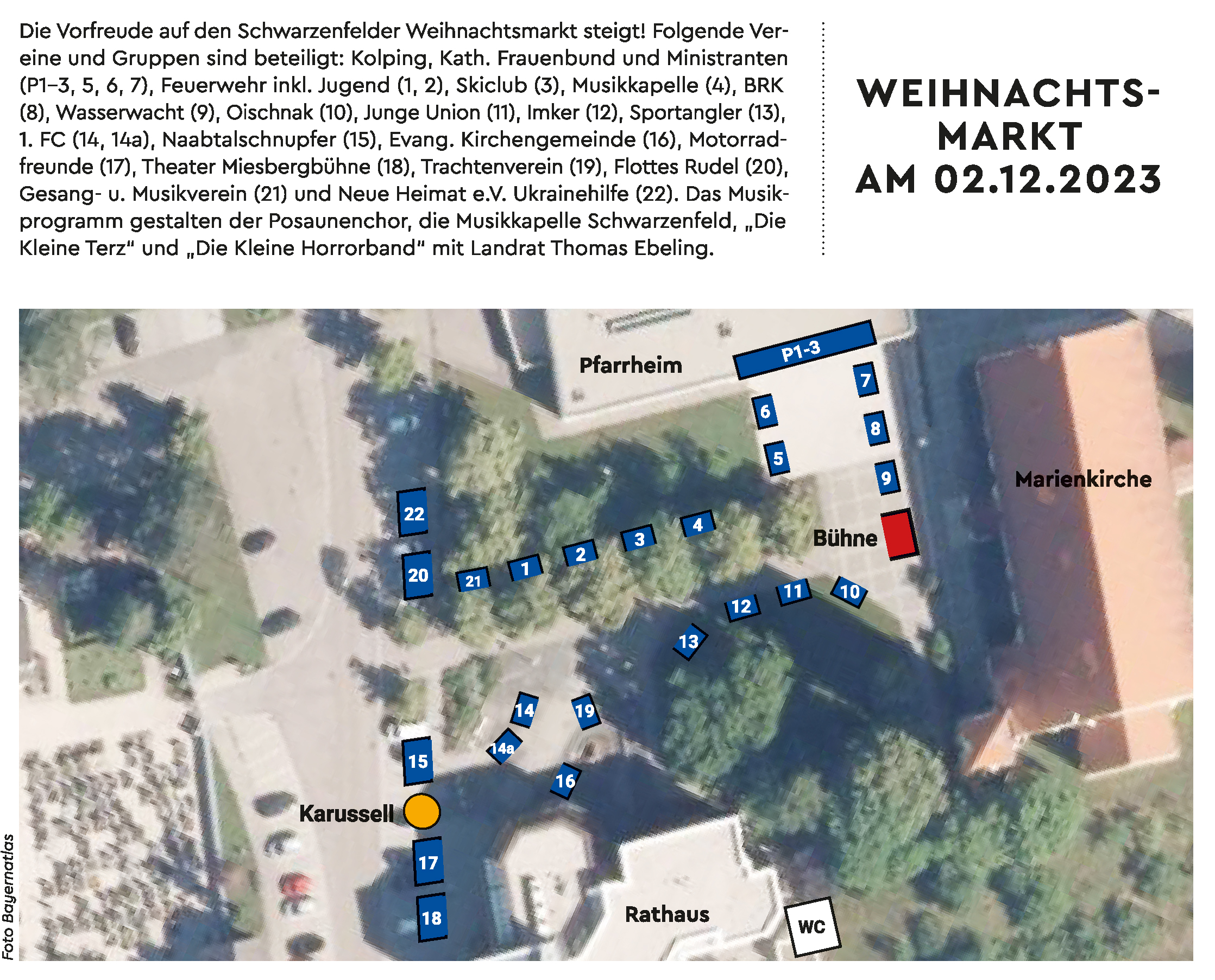 Der Schwarzenfelder Weihnachtsmarkt findet am 02.12. wie im letzten Jahr wieder zwischen Rathaus und Marienkirche statt. Es gibt 26 Buden, die von 21 Vereinen und Organisationen aus Schwarzenfeld unter der organisatorischen Leitung der Marktverwaltung für diesen einen Veranstaltungstag aufgebaut und betrieben werden. Eine Übersichtsskizze ist hier zu finden. Neben Gebasteltem und Nützlichem steht vor allem das leibliche Wohl mit einem breiten Angebot an Speisen und Getränken sowie das abwechslungsreiche Programm im Vordergrund, das sich wie folgt zusammensetzt. 11:30 Uhr: Eröffnung mit Bürgermeister Peter Neumeier und Musikkapelle Schwarzenfeld Best Age; 14:00 Uhr: Musikkapelle Schwarzenfeld Nachwuchsorchester; 14:30 Uhr: Der Nikolaus kommt zum Weihnachtsmarkt; 15:30 Uhr: Evangelischer Posaunenchor; 16:00 Uhr: Der Nikolaus kommt zum Weihnachtsmarkt (inkl. Ansprache); 16:00 Uhr: Adventliche Besinnung mit geistlichen Texten und Musik in der Marienkirche; 17:00 Uhr: Musikkapelle Schwarzenfeld Blasorchester; Ab 18:45 Uhr: Abendmusikprogramm mit den Bands "Kleine Terz" und "Die Kleine Horrorband" mit Landrat Thomas Ebeling. Der Markt und die beteiligten Vereine und Gruppen freuen sich auf zahlreiche Besucherinnen und Besucher aus Nah und Fern. Die Viktor-Koch-Straße wird zur Durchführung des Weihnachtsmarktes bereits ab Freitag Früh auf Höhe des Rathauses voll gesperrt werden.