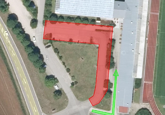 Im Zuge von Arbeiten am Dach der Sportparkhalle muss zur Sicherung der Arbeitsstelle der in der Skizze rot markierte Bereich vor der Sportparkhalle ab heute, 18.03. bis voraussichtlich 25.03. gesperrt werden! Der Zugang zur Halle für Fußgänger erfolgt über den erhöhten Weg am Gebäude entlang – grüner Pfeil in der Skizze.