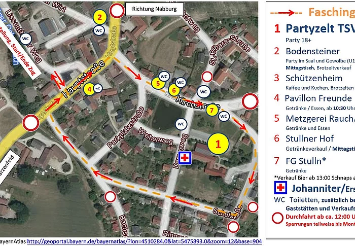 Der TSV Stulln als Veranstalter informiert über Folgende Punkte zum Stullner Faschingstreiben am Sonntag, 02.03.2025: Lageplan, siehe Skizze unten. Neu hinzugekommen sind die Pavillon-Freunde die bereits ab 10:30 Uhr einen Frühschoppen anbieten werden. Die FG bietet ab 12 Uhr Wienersemmeln an. Anfahrt, siehe Skizze unten.  Bitte beachtet die gesperrten Wege! Parken, siehe Skizze unten.  Besucher können in weiten Teilen des Gemeindegebiets parken. Oft weist die Feuerwehr ein. Auch von den…