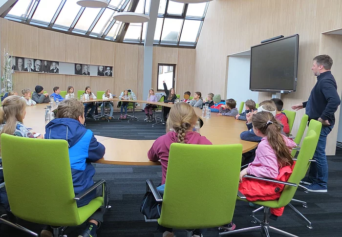 Zuerst durften die Kinder einen Blick in die Kämmerei werfen. Dort lernten sie, wie die Finanzen der Gemeinde verwaltet werden. Besonders beeindruckt waren die Schüler von einem Vergleich: Ein Kubikmeter Wasser aus der Leitung…